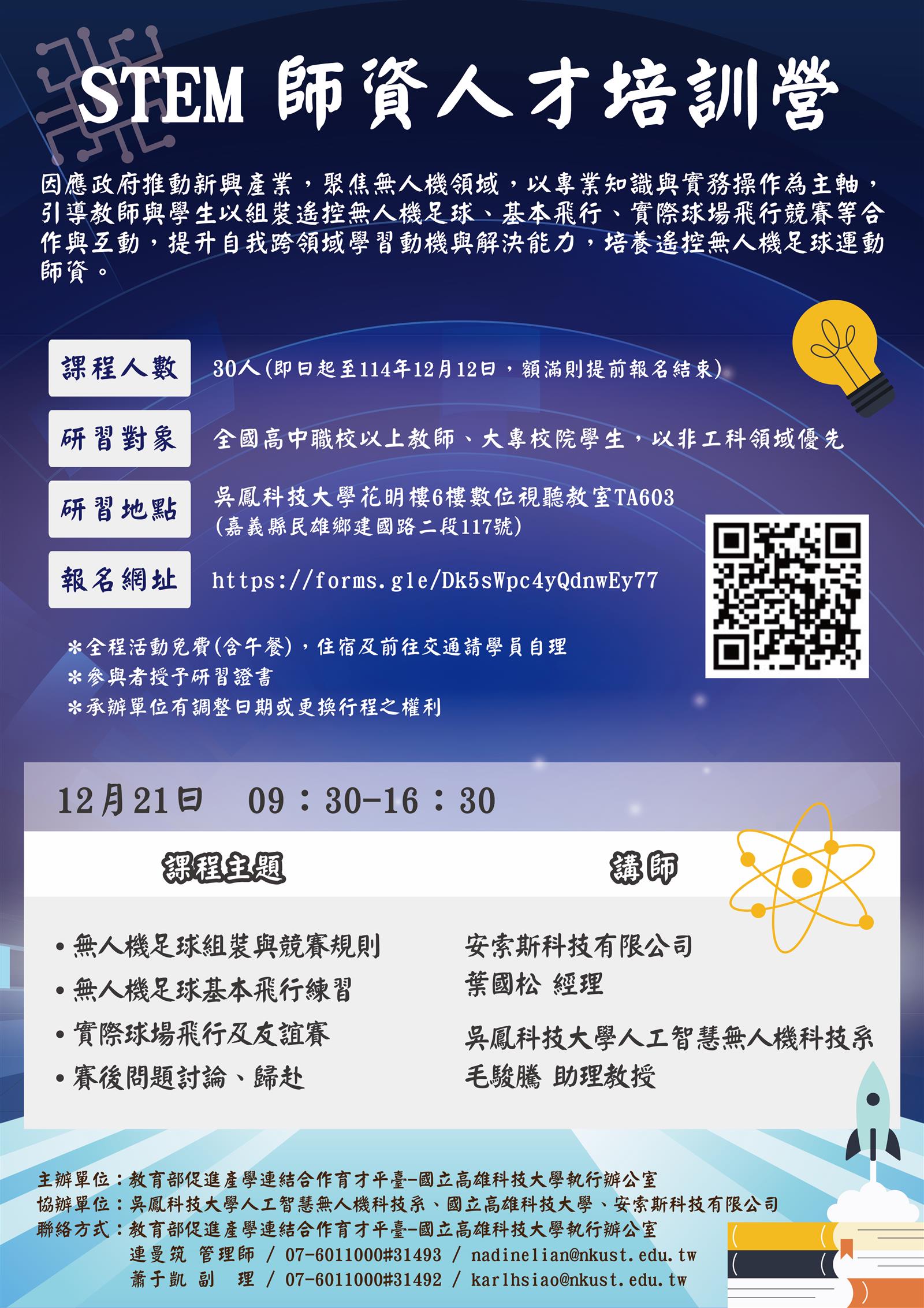 有關教育部促進產學連結合作育才平臺-國立高雄科技大學執行辦公室與吳鳳科技大學共同辦理「STEM師資人才培訓營」,邀請教師及學生踴躍報名參加。