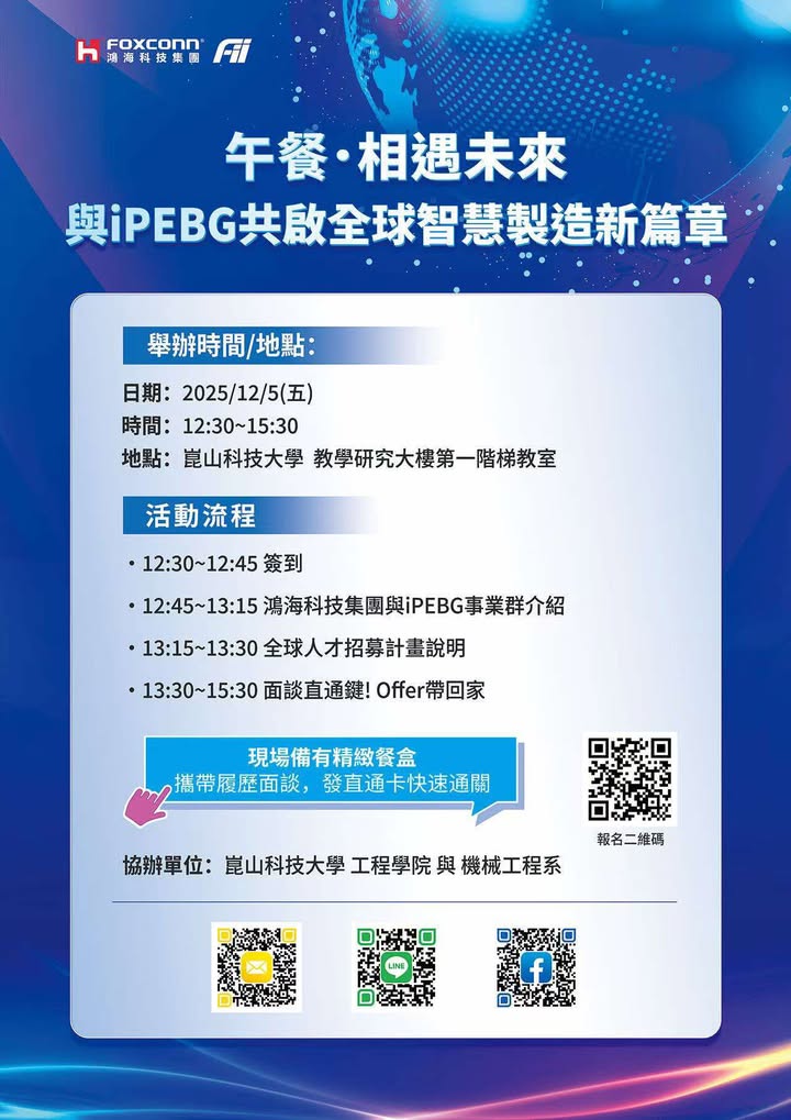 鴻海集團iPEBG在12/5(五)跟崑山科大工程學院 與機械工程系合作舉辦一場招募說明會,有供學生午餐!誠摯歡迎南臺科大的同學報名, 一起參與活動和面談!