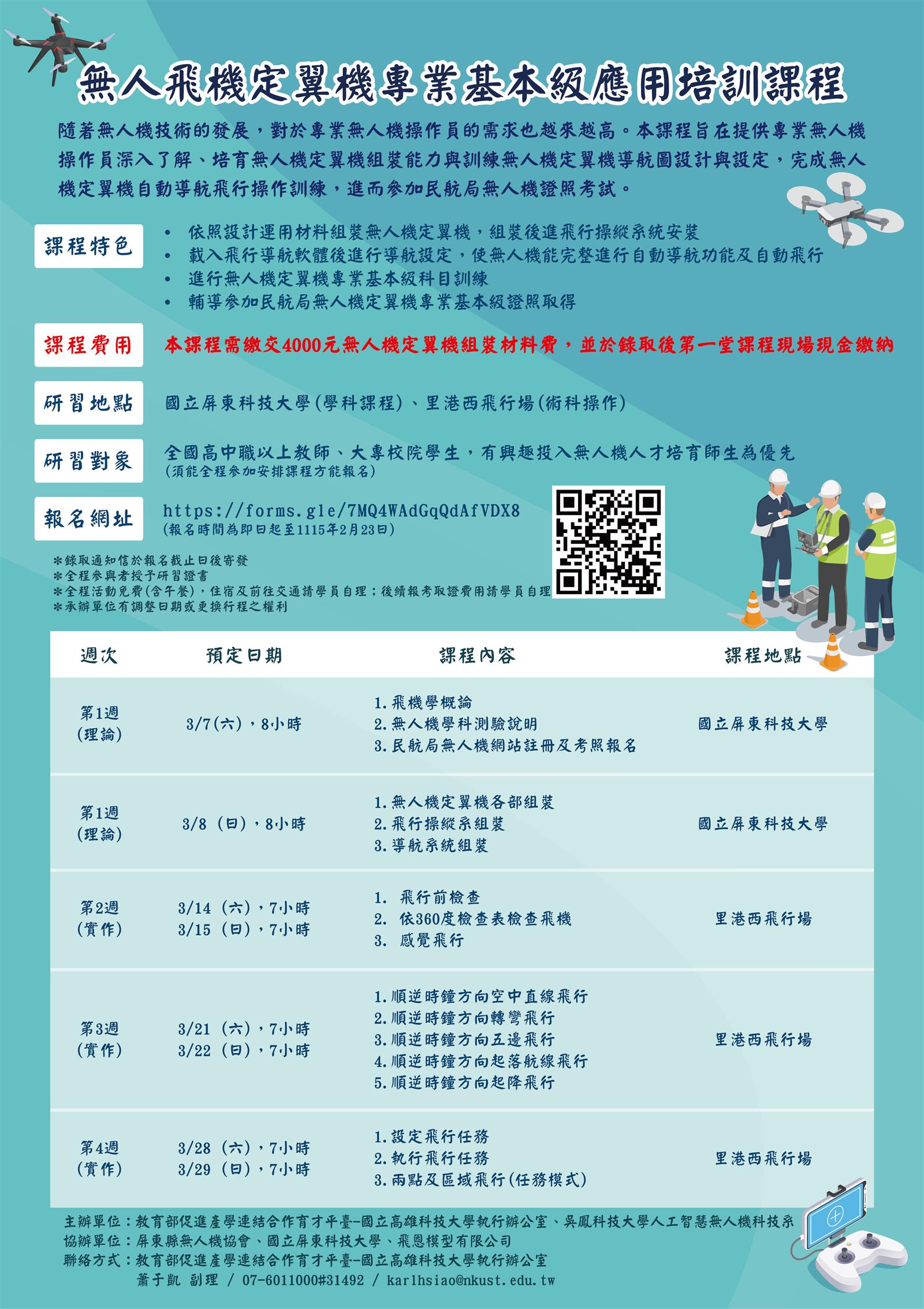 (二)課程地點:國立屏東科技大學(學科課程)、里港西飛行場(術科操作)。