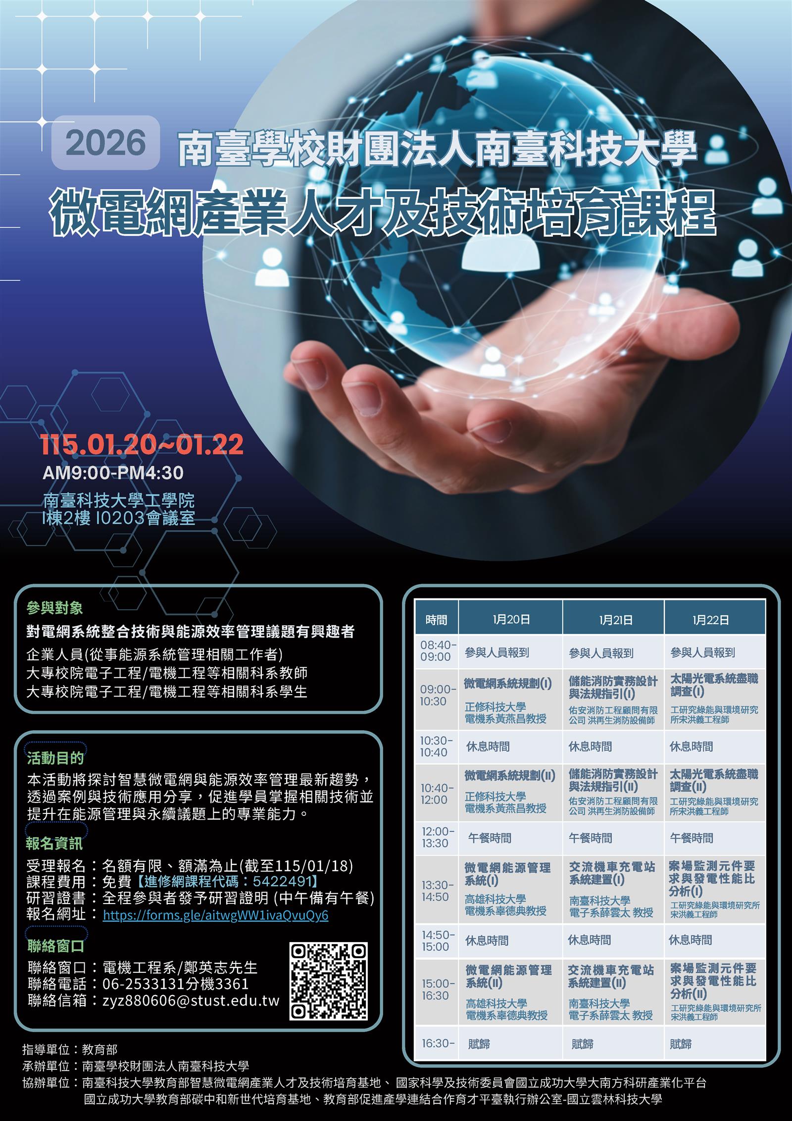 有關國立雲林科技大學推動教育部育才平臺計畫,協助辦理南臺科技大學「微電網產業人才及技術培育課程」,敬邀師生參與。