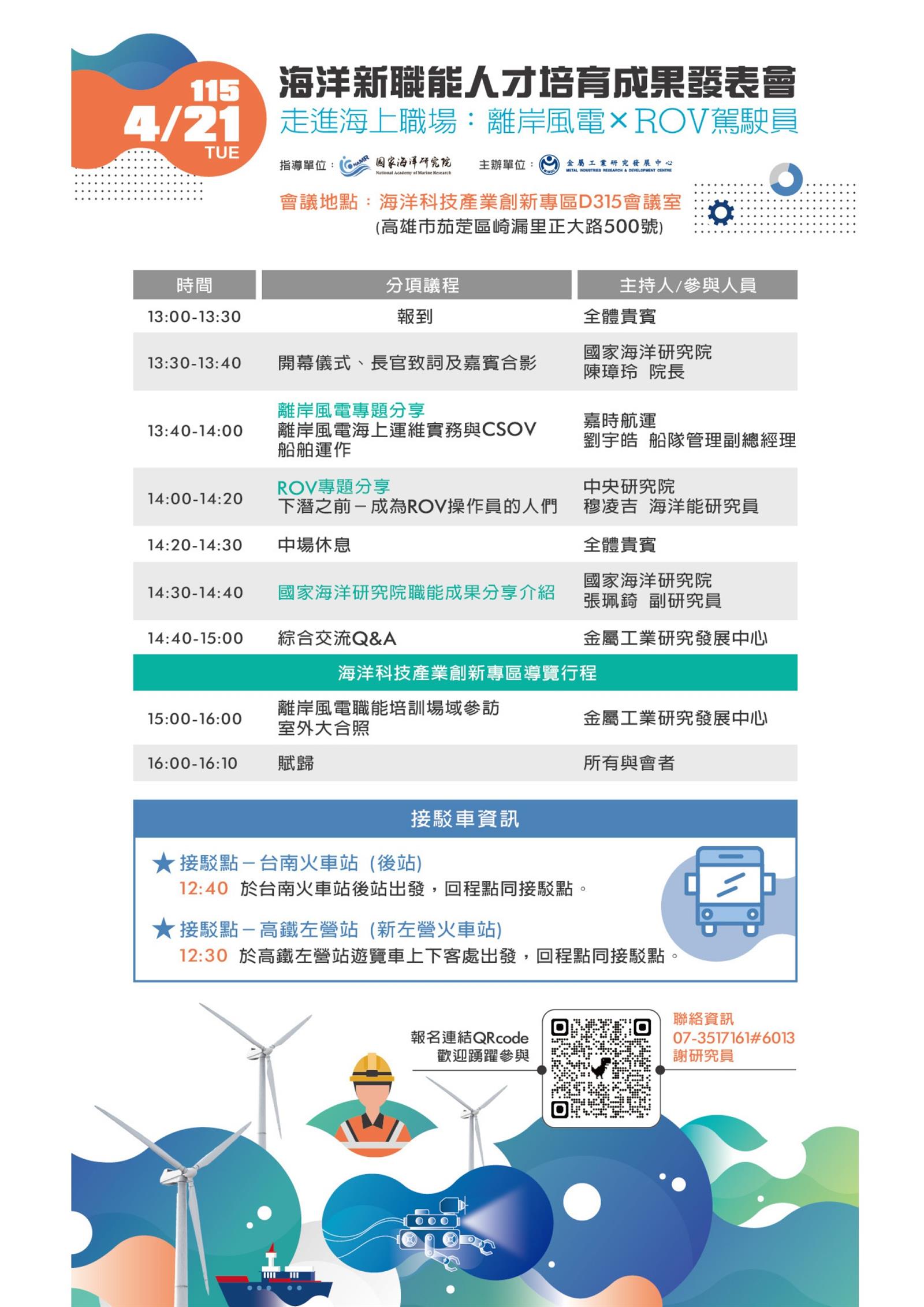 一、為落實海洋國家願景並精準對接產業人力需求,國家海洋研究院訂於115年4月21日辦理「海洋新職能人才培育成果發表會」,聚焦離岸風電及ROV(水下遙控無人載具)等海洋產業領域,邀請產業專家分享產業發展與職涯經驗。