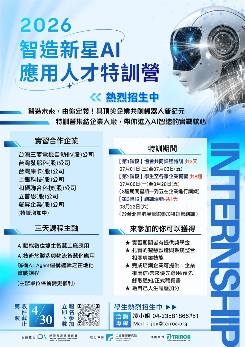 三、招募對象為工學院相關理工系所之大學部三、四年級及碩士班一、二年級學生,透過企業面試後於今年暑假期間進行特訓,履歷投遞分為兩階段:第一階段截止於2026年4月30日,最後收件日為2026年5月15日,第一階段收件先媒合,若還有名額開放第二段媒合,歡迎踴躍報名。